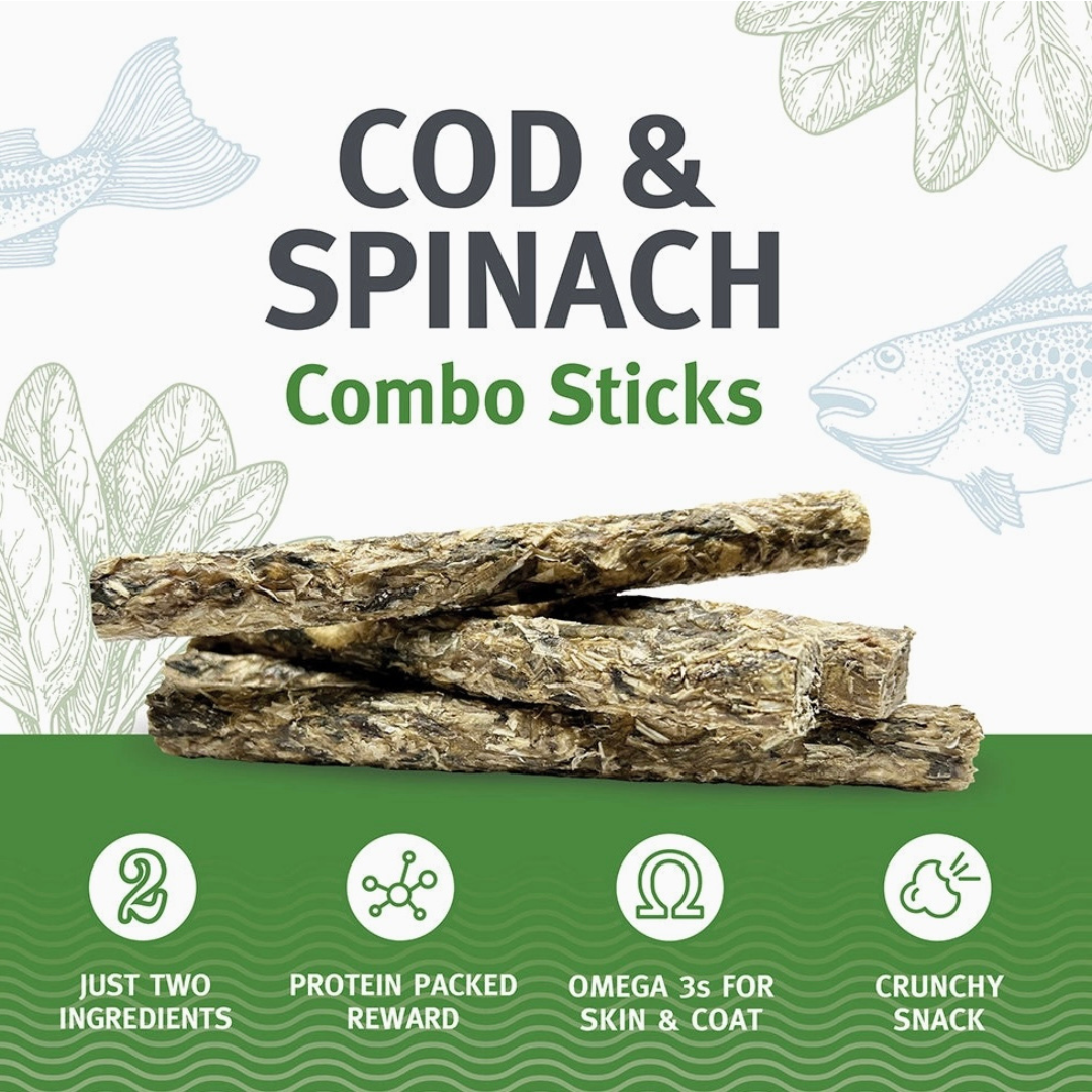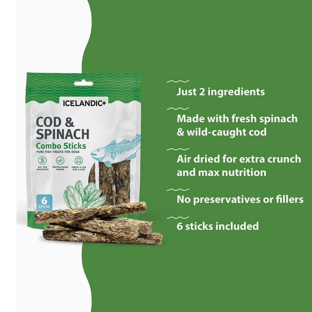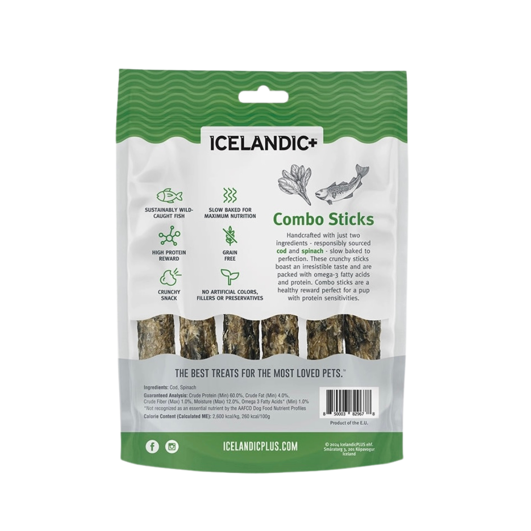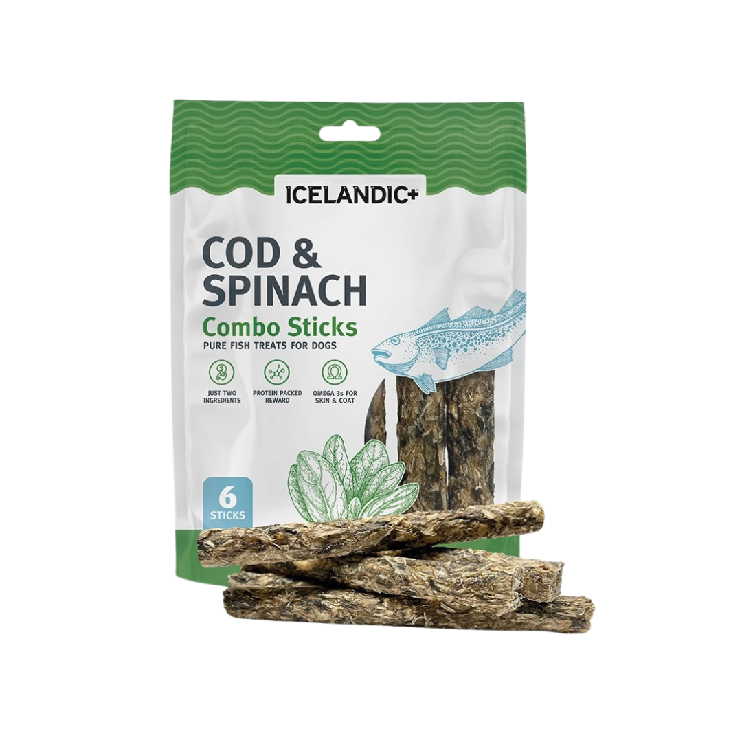 Give your dog a nutritious, tasty reward with Icelandic Cod & Spinach Treat Sticks—a natural, health-focused option for discerning pet parents.