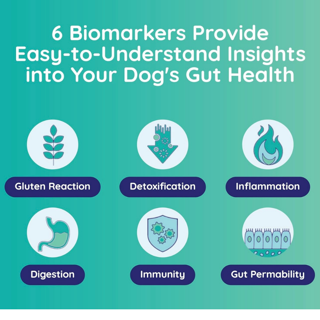 The Gut Check test evaluates six scientifically validated biomarkers to help identify whether your dog has gut inflammation, increased intestinal permeability (leaky gut), poor digestive enzyme function, or early signs of food antigen sensitivity.