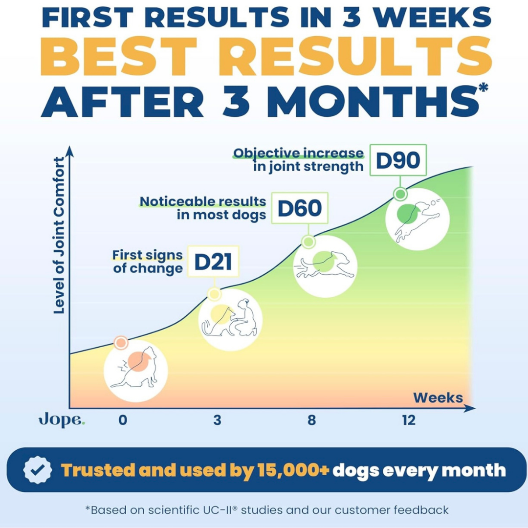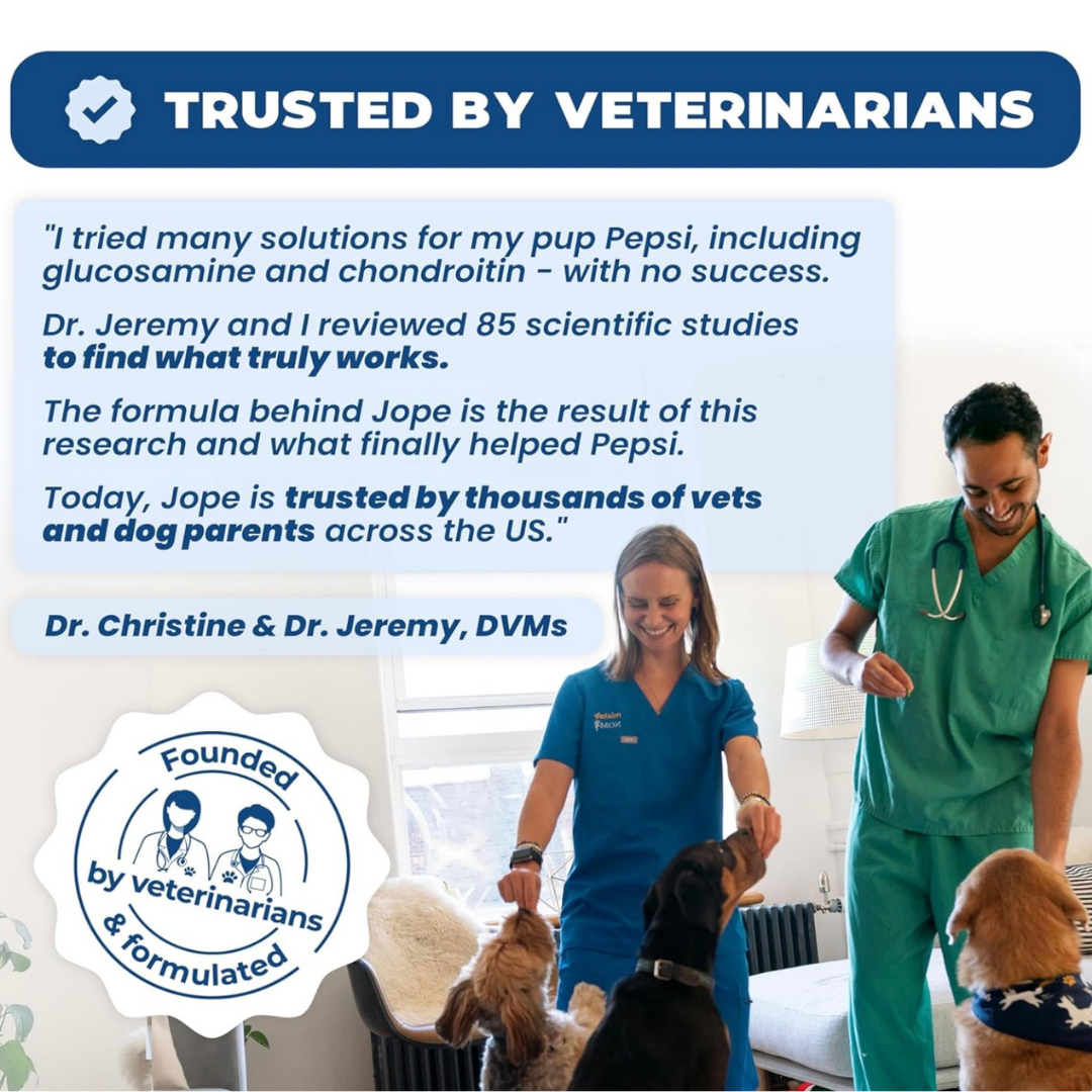 Every tail wag, stretch, and zoomie depends on healthy joints. Over time, though, wear and tear, inflammation, or genetics can lead to stiffness and discomfort. Jope Hip & Joint Chews were created to help your dog move freely again—using a science-backed blend of anti-inflammatory nutrients and regenerative compounds that support cartilage health, reduce inflammation, and improve flexibility from the inside out.