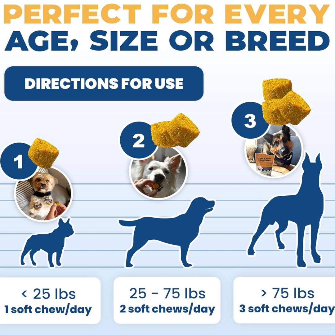 Feed daily based on your dog’s weight. These soft chews can be given as a treat, meal topper, or part of your daily joint-care routine. Consistent use supports long-term joint comfort and mobility.
