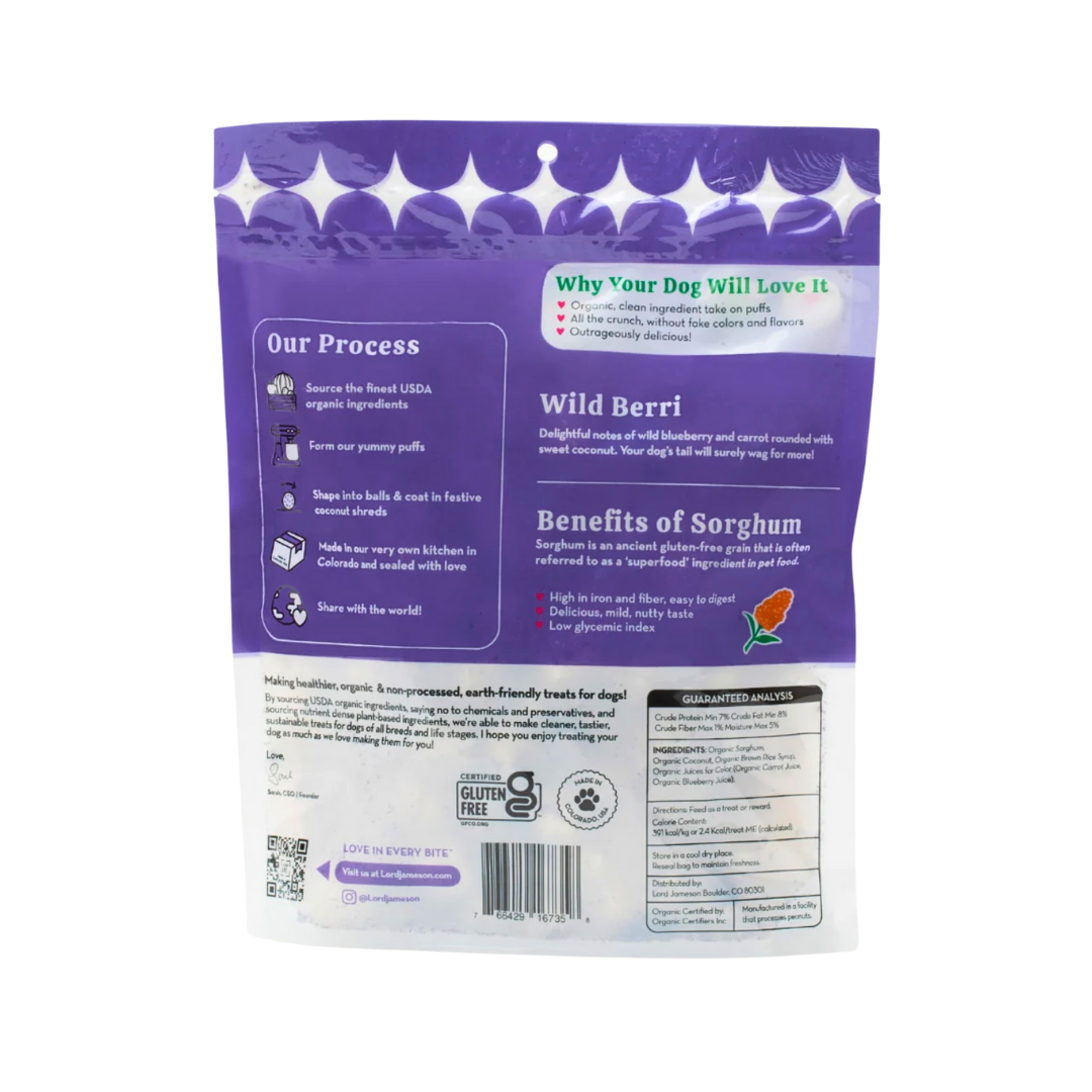 Give your dog a playful boost of superfood nutrition with Lord Jameson Wild Berri Love Puffs—a delightfully crisp blend of organic blueberry, carrot, and coconut. These light, airy treats are gently puffed for maximum crunch and packed with real, whole-food ingredients to support your dog’s immune health, digestion, and overall wellness.