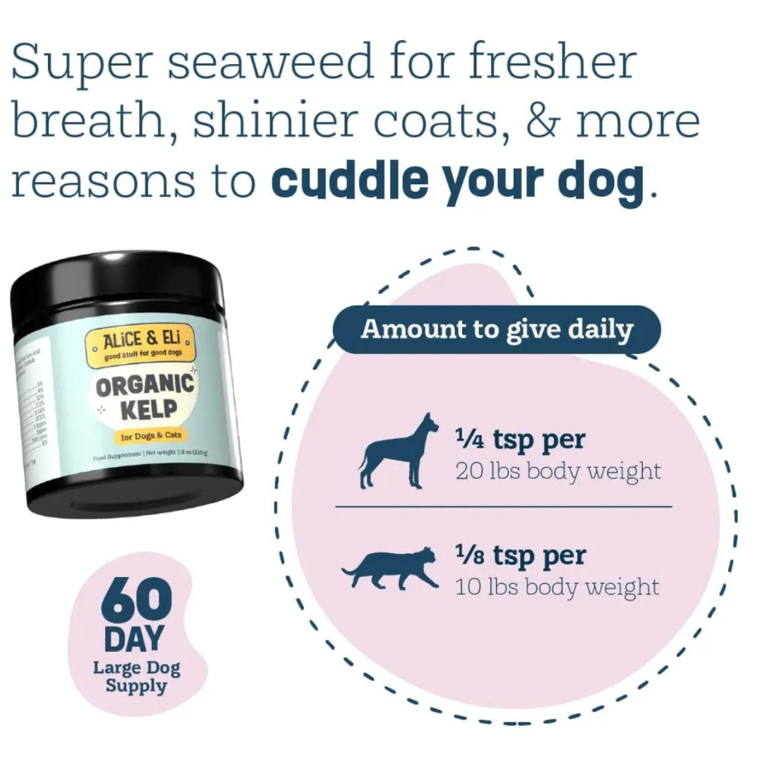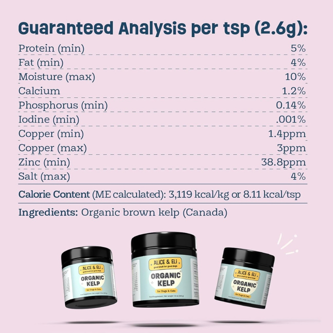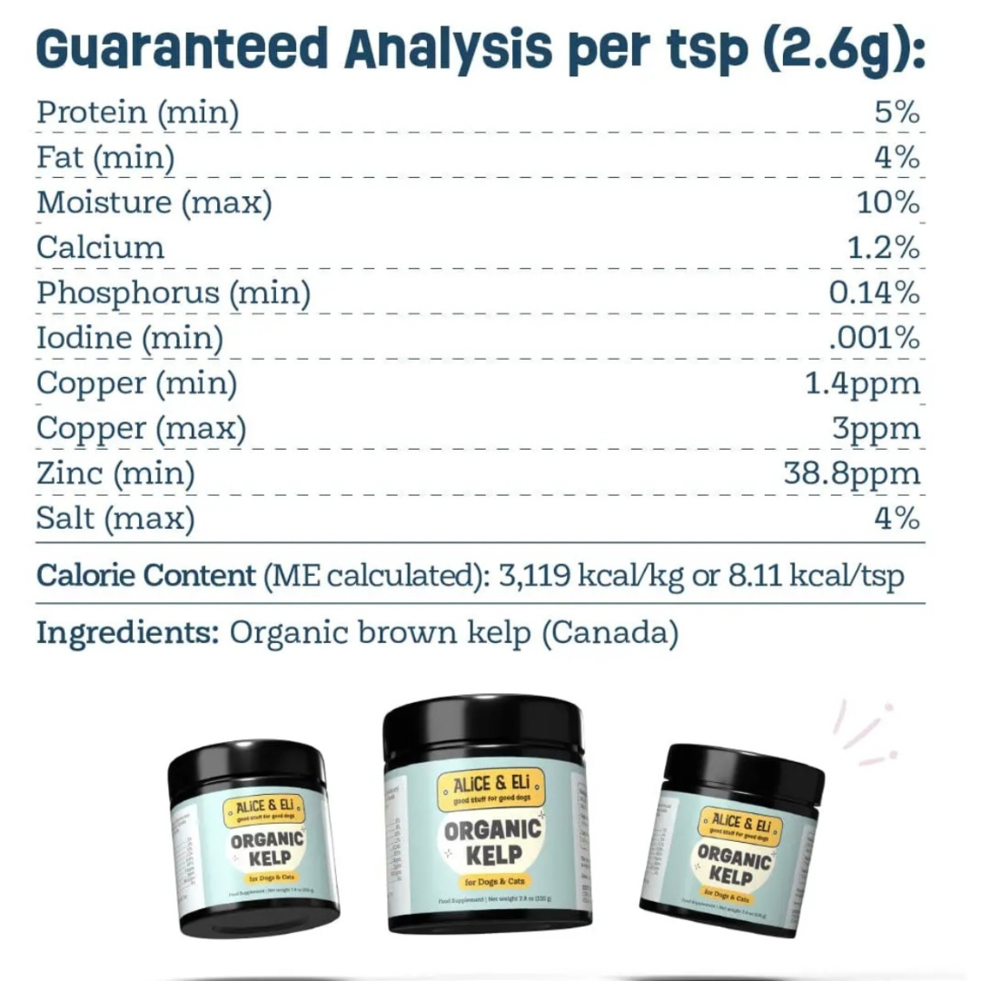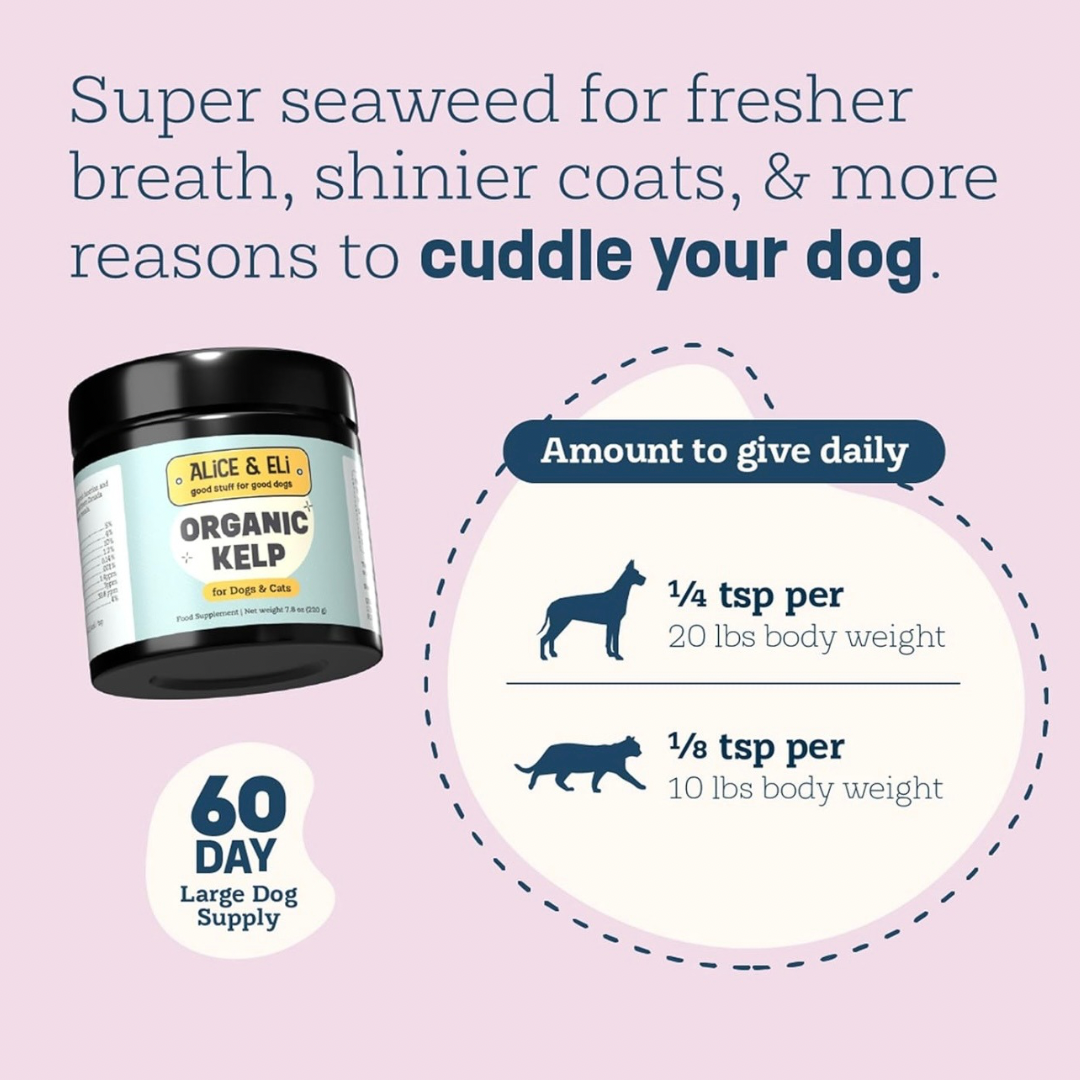 Alice & Eli Organic Kelp offers powerful, whole-food mineral support from the sea that nourishes your dog’s thyroid, skin, immune system, and more with one pure, ocean-grown ingredient.