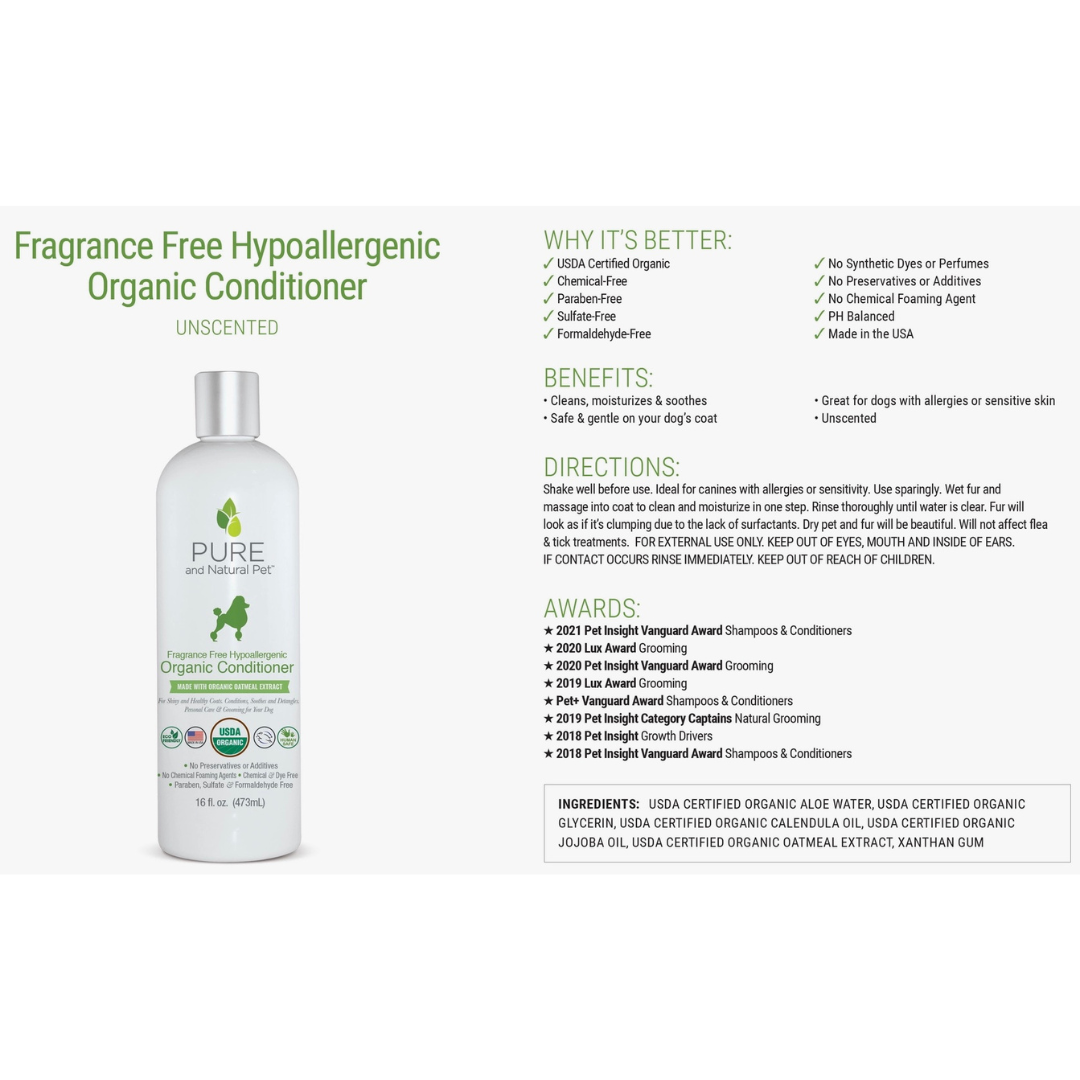 Pure and Natural Pet Hypoallergenic Organic Conditioner is a fragrance-free, ultra-gentle solution designed for dogs with sensitive skin, allergies, or fragrance sensitivities. Made with USDA Certified Organic ingredients, this rich, nourishing conditioner helps restore hydration, soften the coat, and calm irritated skin—without harsh chemicals or artificial fragrances.
