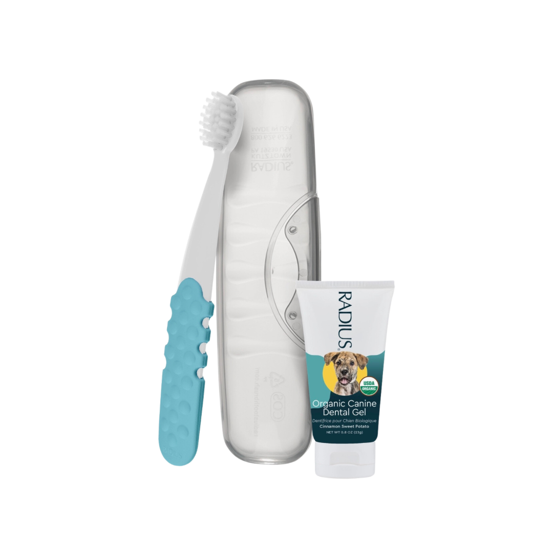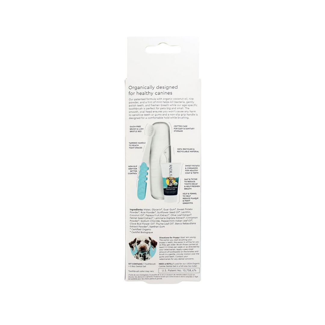 Your favorite canine organic dental solution that will help keep those canines healthy for life. This organic dental kit contains a premium toothbrush and a handy 0.8 ounce travel tube of organic dental gel and a FREE clear, critter case for handy, mess-free storage.