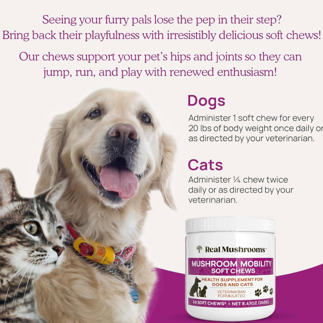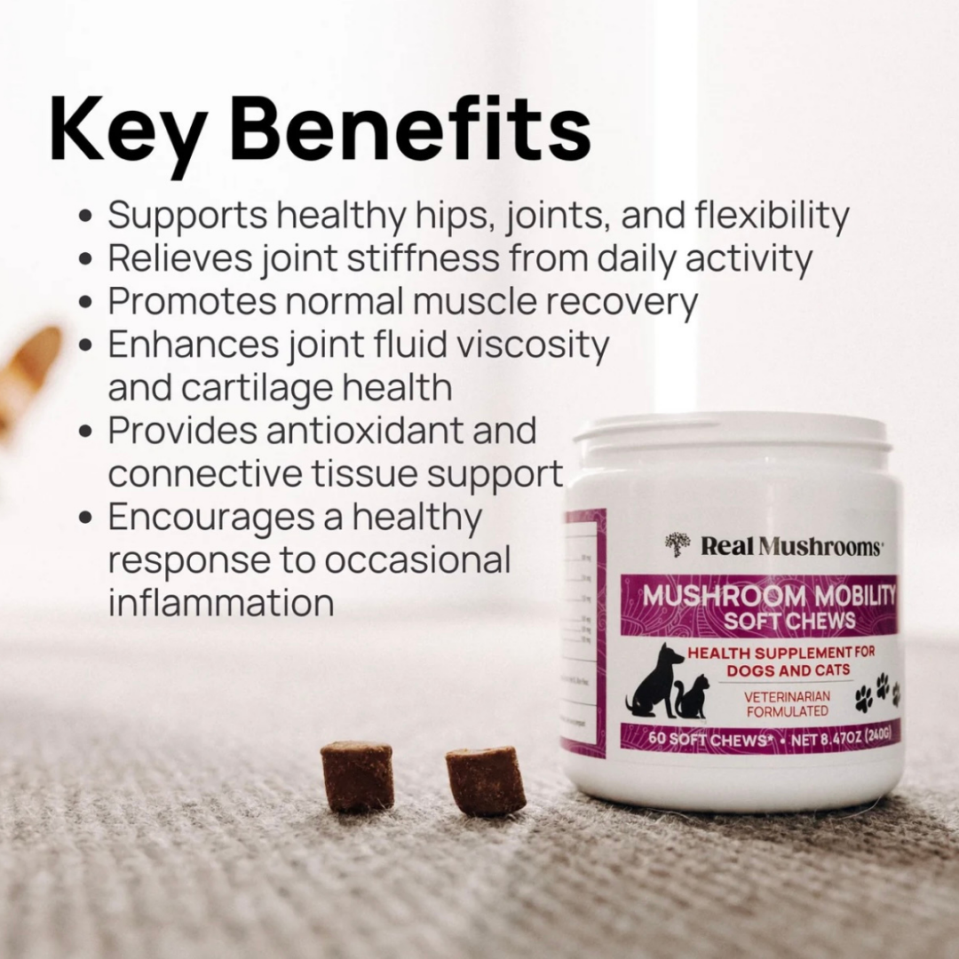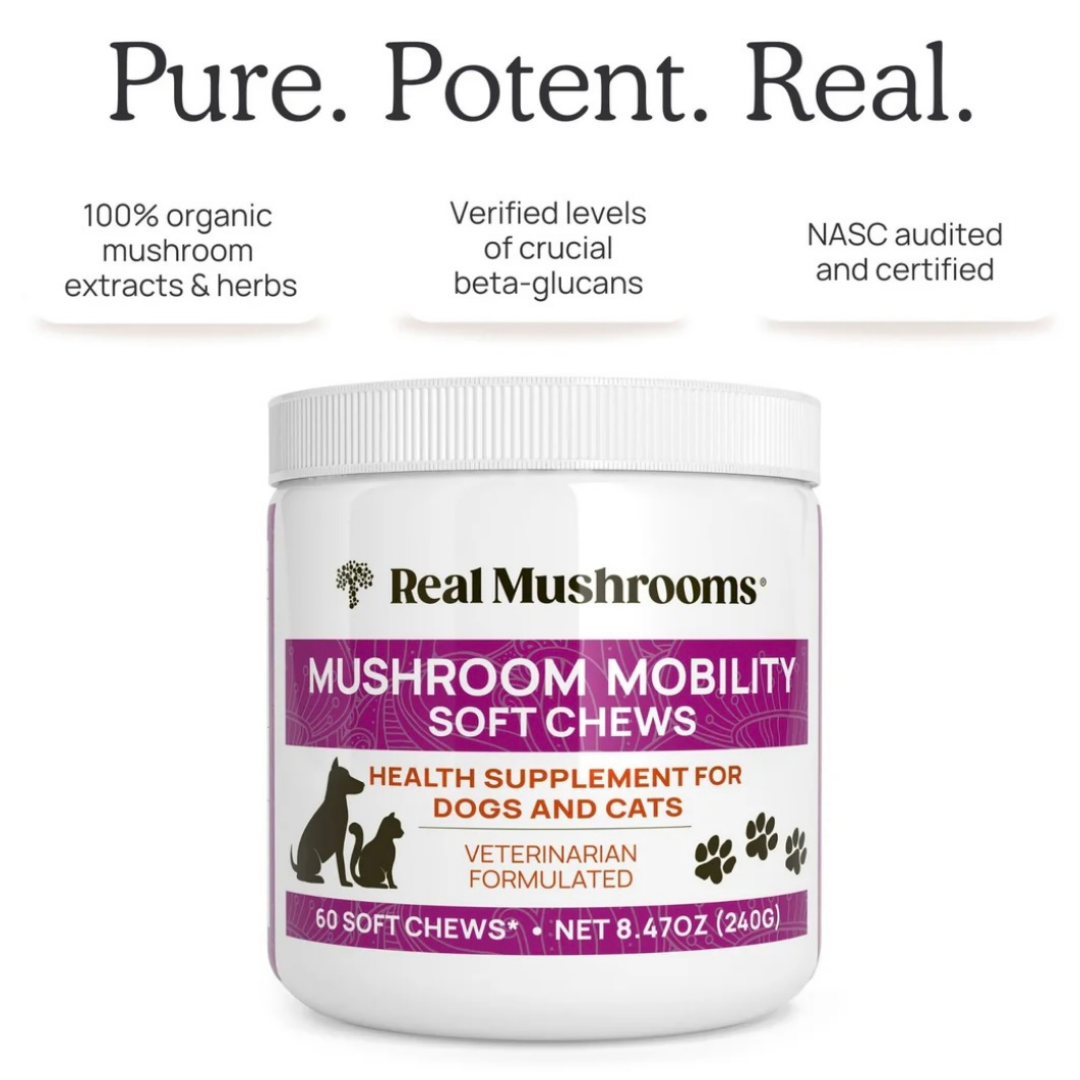 Real Mushrooms Mushroom Mobility Chews go beyond basic joint care, offering a complete, research-backed formula that supports comfort, movement, and long-term joint health. With no fillers and only therapeutic ingredients, this is the kind of joint support your dog deserves.