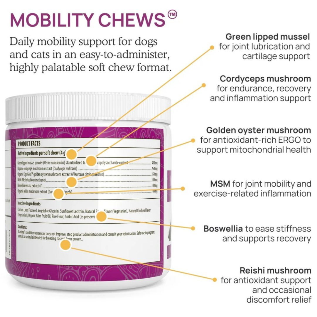 Many joint supplements rely on a single ingredient or only address surface-level symptoms. Mushroom Mobility Chews are different. They combine the anti-inflammatory power of functional mushrooms with proven joint-support ingredients that nourish your dog’s body from the inside out.