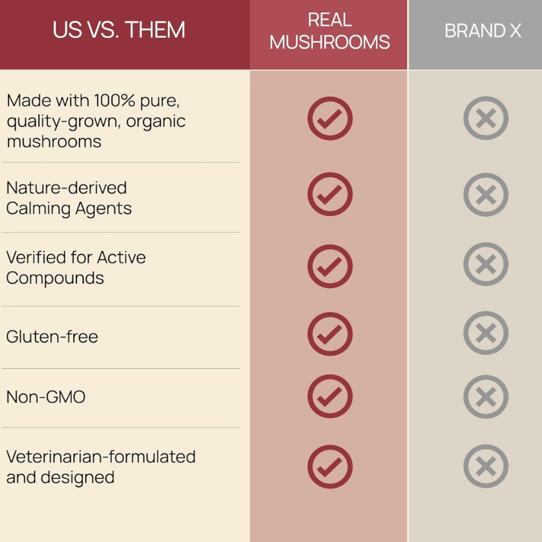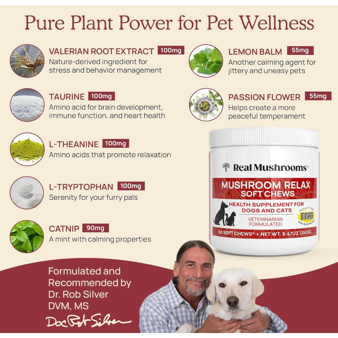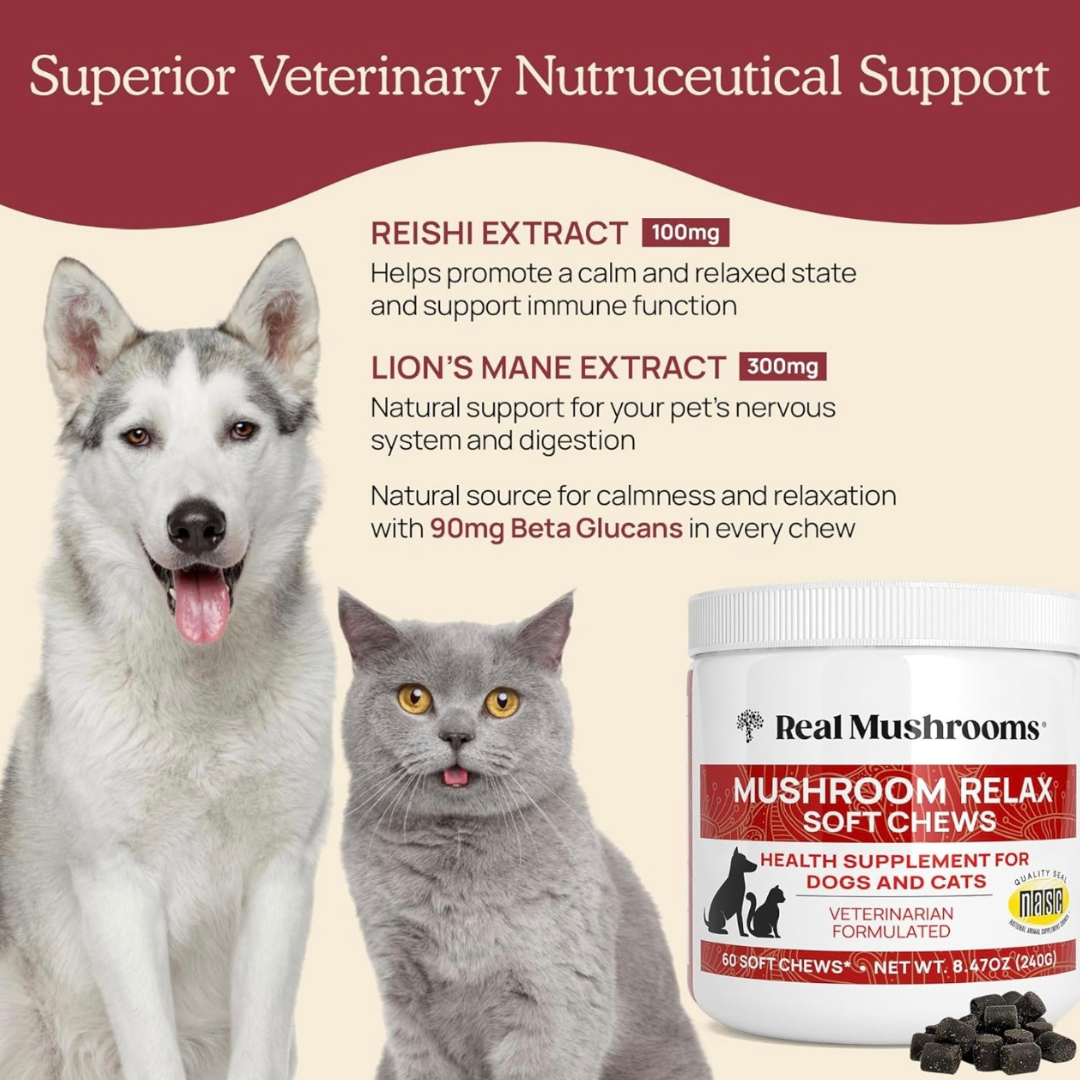If your dog struggles with anxiety, stress, or nervous energy, you’re not alone. Whether it’s triggered by separation, visitors, loud noises, or overstimulation, these stress responses often stem from a dysregulated nervous system. Relax Chews by Real Mushrooms are designed to help soothe those stress circuits gently and naturally.