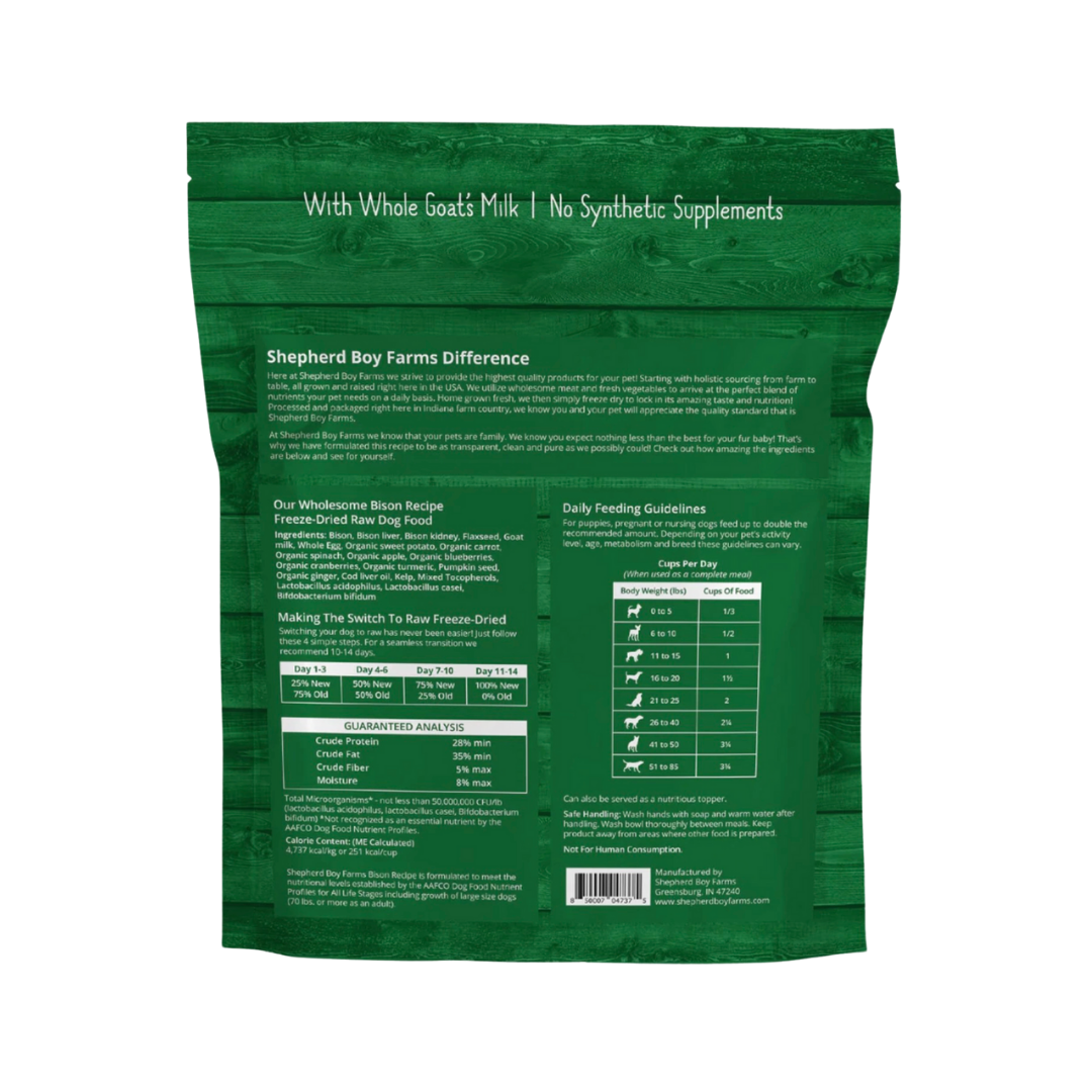Looking for a highly digestible, protein-rich formula that nourishes your dog from nose to tail? Shepherd Boy Farms Freeze-Dried Raw Bison combines responsibly sourced bison muscle meat, kidney, and liver with a powerful blend of functional superfoods, probiotics, and omega-rich ingredients—all freeze-dried to lock in flavor and nutrients. This single-animal-protein formula is ideal for dogs with food sensitivities, and delivers balanced support for digestion, inflammation, immune resilience, and overall vitality.