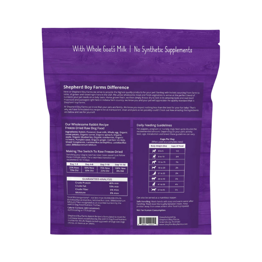 If your dog struggles with food sensitivities, chronic inflammation, or digestive issues, Shepherd Boy Farms Freeze-Dried Raw Rabbit offers a nourishing solution. This single-protein formula features clean, lean rabbit meat as the star ingredient—combined with goat milk, flaxseed, whole egg, organic produce, and probiotics to support total-body wellness. It’s freeze-dried raw to retain nutrients and flavor, making it a complete and balanced meal or nutrient-rich topper or treats for dogs needing a fresh start.