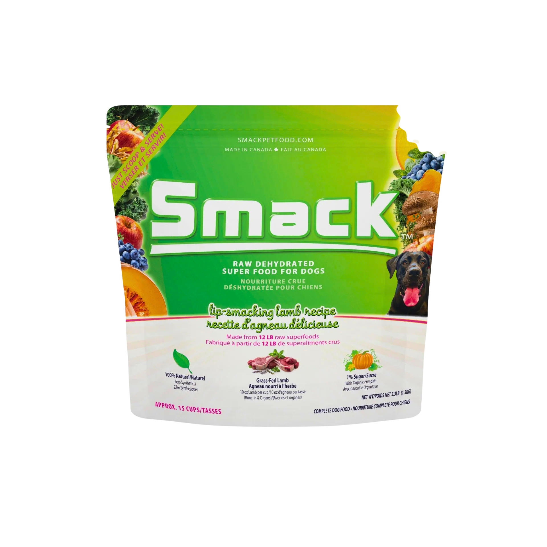 Smack’s Raw Dehydrated Lamb Recipe makes real food feeding simple. Crafted from fresh, whole Canadian lamb and superfoods like pumpkin, kale, and blueberries, this gently air-dried blend nourishes your dog from nose to tail. Every bite delivers the nutrition of raw food—without the mess or prep. Serve it as a complete meal, a nutritious topper, or a high-value treat your dog will love.