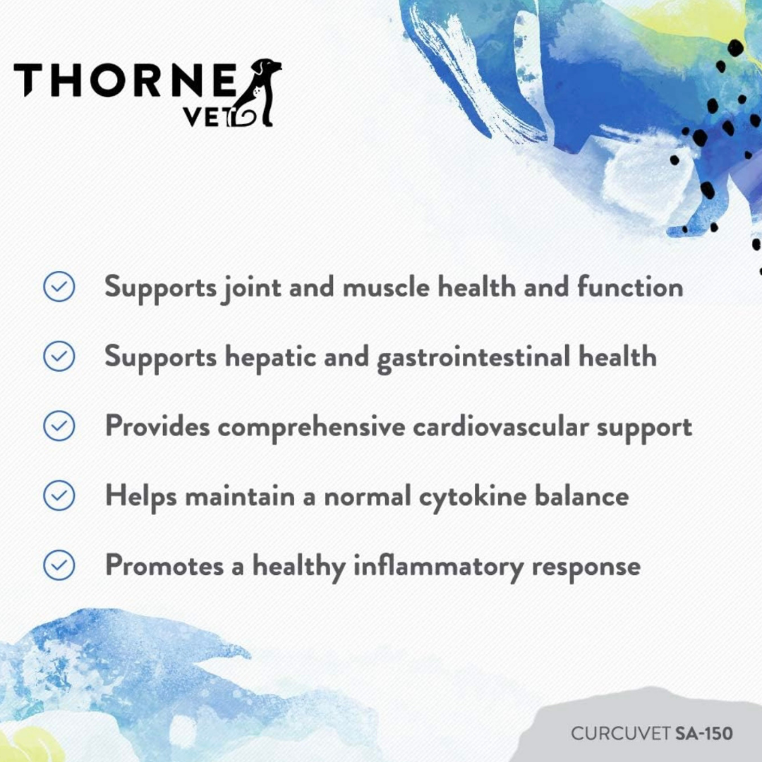 With clinically tested phytosome technology and a clean, highly absorbable formula, ThorneVet CurcuVET®-SA150gives your dog reliable inflammation support at the cellular level. It’s a natural way to help your dog move better, think clearer, and age more gracefully.