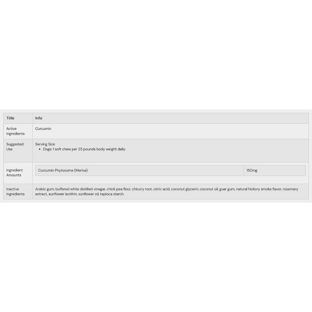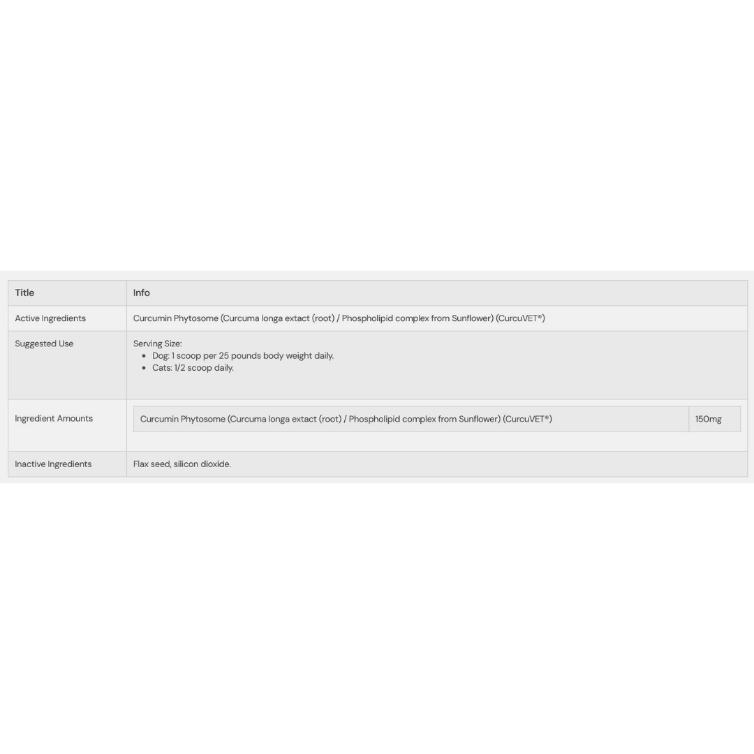 CurcuVET® solves this problem with phytosome technology, which binds curcumin to sunflower-derived phospholipids. This natural delivery system makes it much easier for your dog’s body to absorb and use curcumin where it matters most. With better absorption, every dose goes further—offering your dog real relief from inflammation and oxidative stress, while also supporting joint cartilage, connective tissue, liver detox, and brain health.