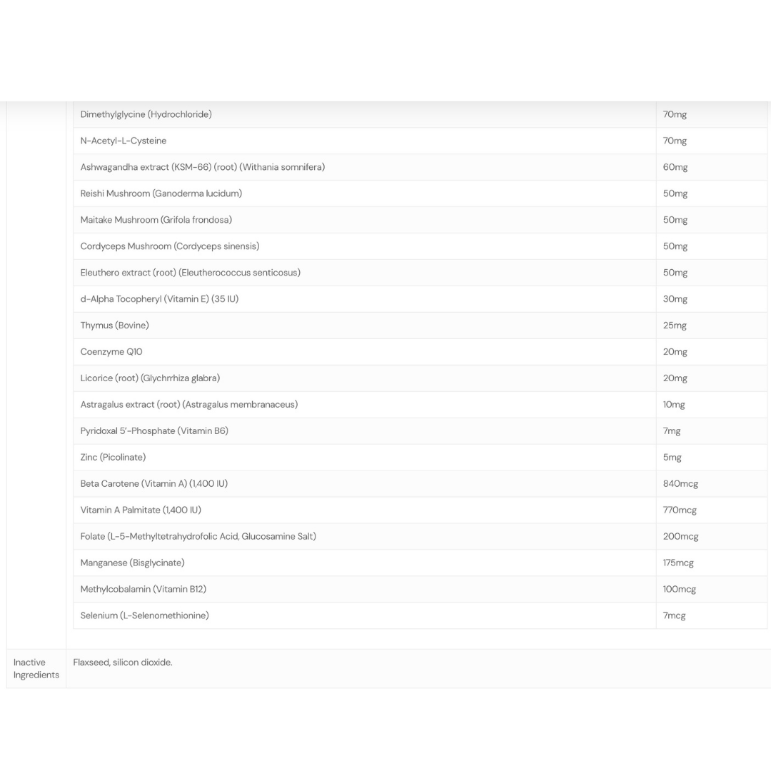→ CoQ10, Vitamin C, Vitamin E, Beta-Carotene & Selenium – Potent antioxidants that protect immune cells from oxidative damage and support healthy aging