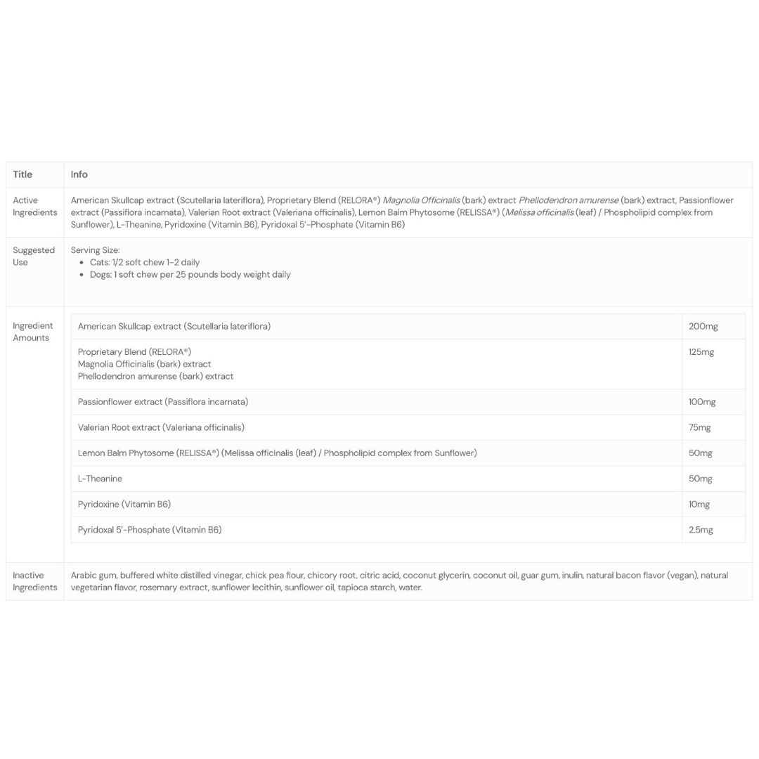 Unlike many calming supplements that only take the edge off, Peaceful Pet goes deeper by supporting neurotransmitter production, modulating cortisol (the stress hormone), and calming the nervous system. L-theanine promotes alpha brain waves for relaxation, RELORA® and RELISSA® botanicals help reduce cortisol, and herbs like valerian, skullcap, lemon balm, and passionflower ease tension without sedation. This multi-pathway support helps dogs feel calm while staying alert and engaged.