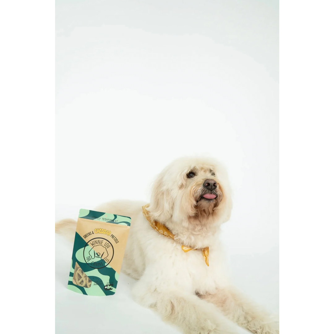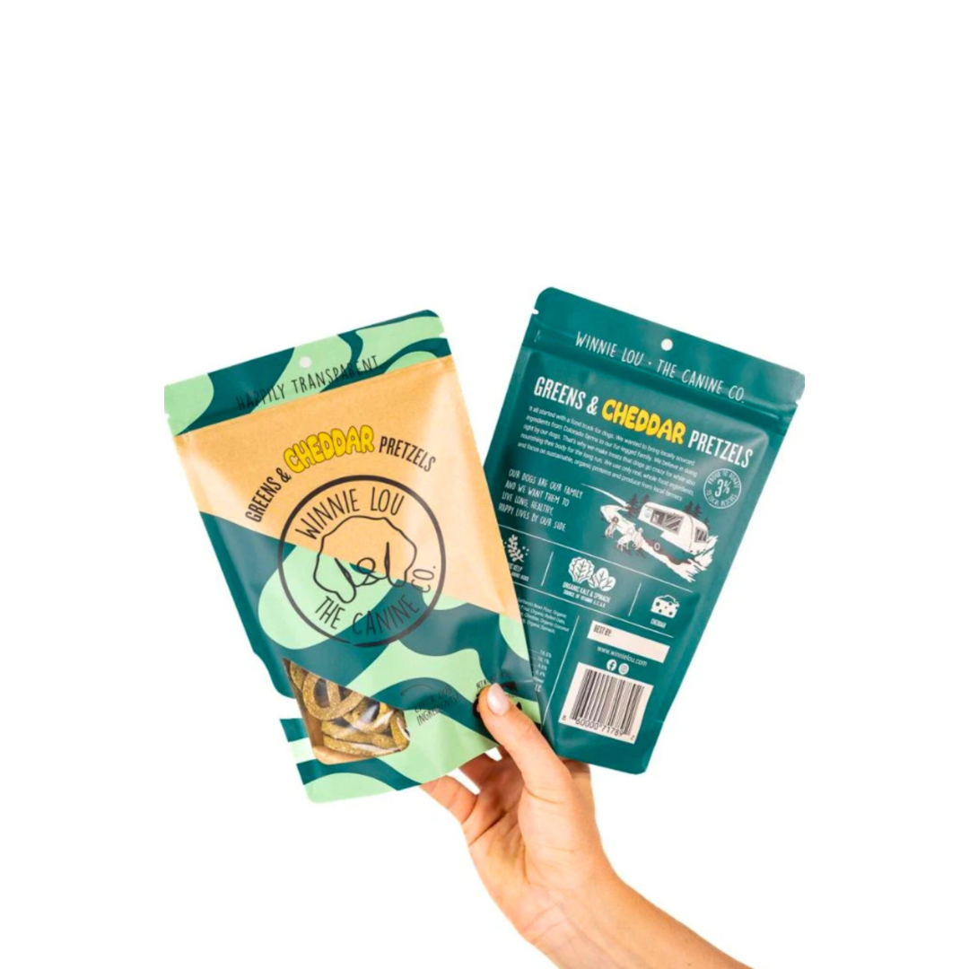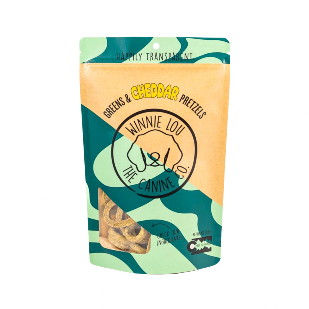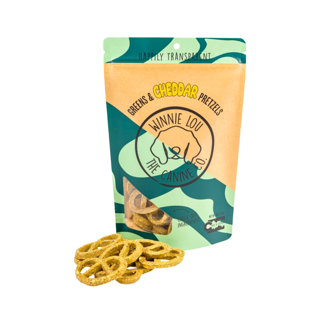 Winnie Lou Greens & Cheddar Pretzels combine the deliciousness of real cheese with the nourishing power of leafy greens—making it easy to reward your dog with something that’s both functional and fun.