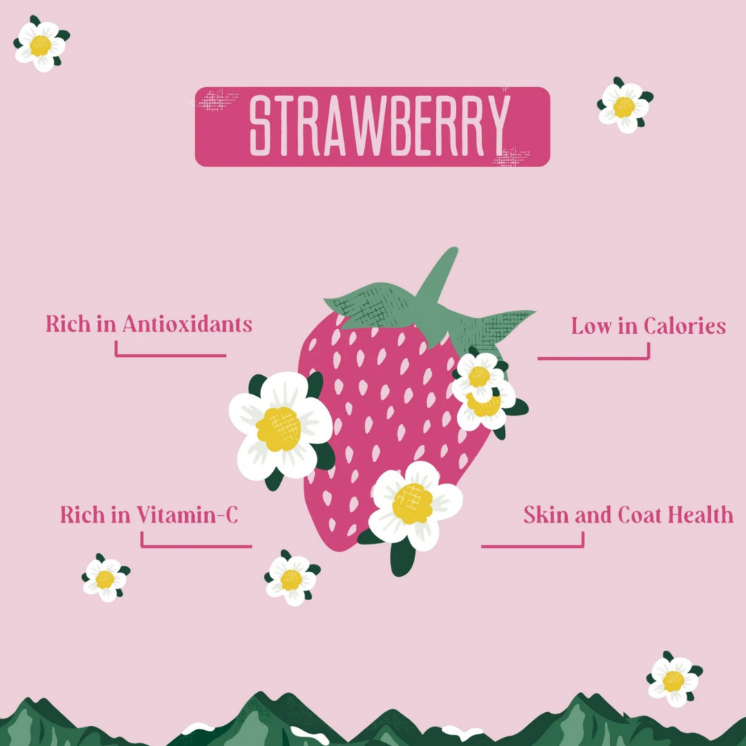 Strawberries are packed with antioxidants, vitamin C, fiber, and natural enzymes that support immune function, skin health, and gentle digestion. Their natural sweetness also makes this chew more enticing—without the need for added sugar or flavorings.